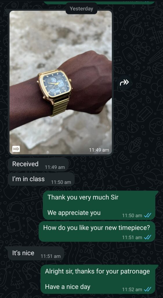“I ordered just for the watch but the FREE bracelet was the cherry on top. Now I have a complete luxury set that cost me less than what most people pay for one fake piece.” – Uche N., Oil & Gas Executive, Port Harcourt